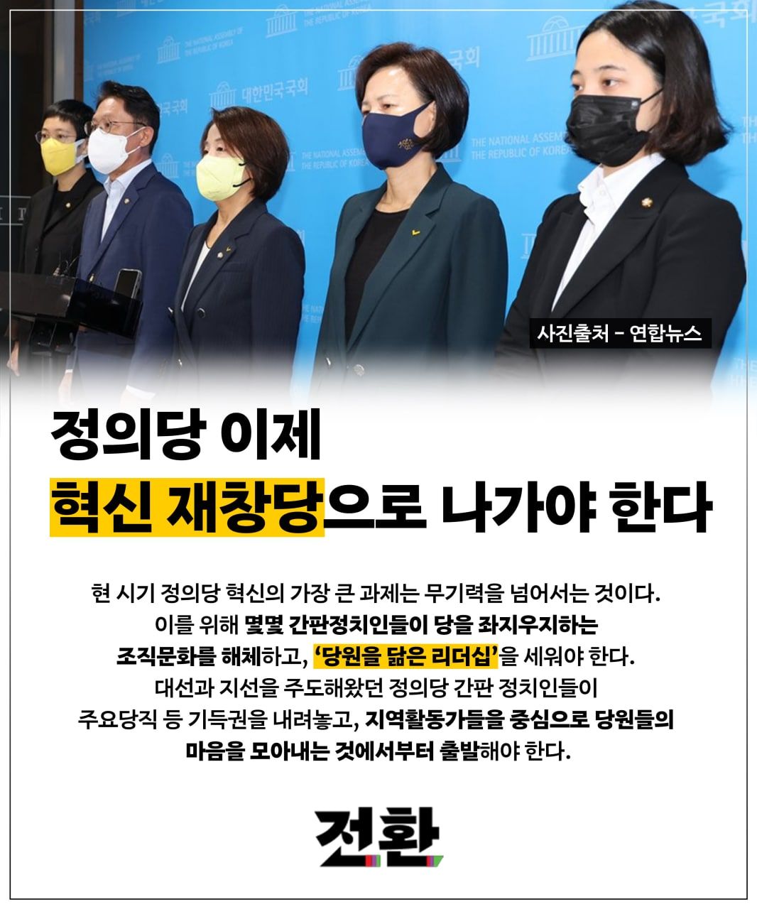 재창당은 형식이 아니라, 실질적인 변화여야 한다. 각자의 이해관계를 내려놓고, 온 힘으로 정의당을 지키고 있는 당원들의 손을 잡고 ‘혁신 재창당’의 길로 함께 가자.