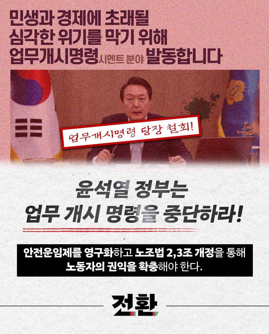 정부는 화물연대 업무개시명령을 즉각 철회하십시오. 화물노동자의 생존권이 곧 국민 안전과 직결됩니다. 전환은 화물 총파업대오를 사수하고 강력한 연대투쟁으로 안전운임제 쟁취를 위한 투쟁을 함께 전개해 나갈 것입니다. 나아가 이번 화물연대 파업을 통해 손배 가압류를 막는 노조법 3조 개정에 또한 함께 하겠습니다.