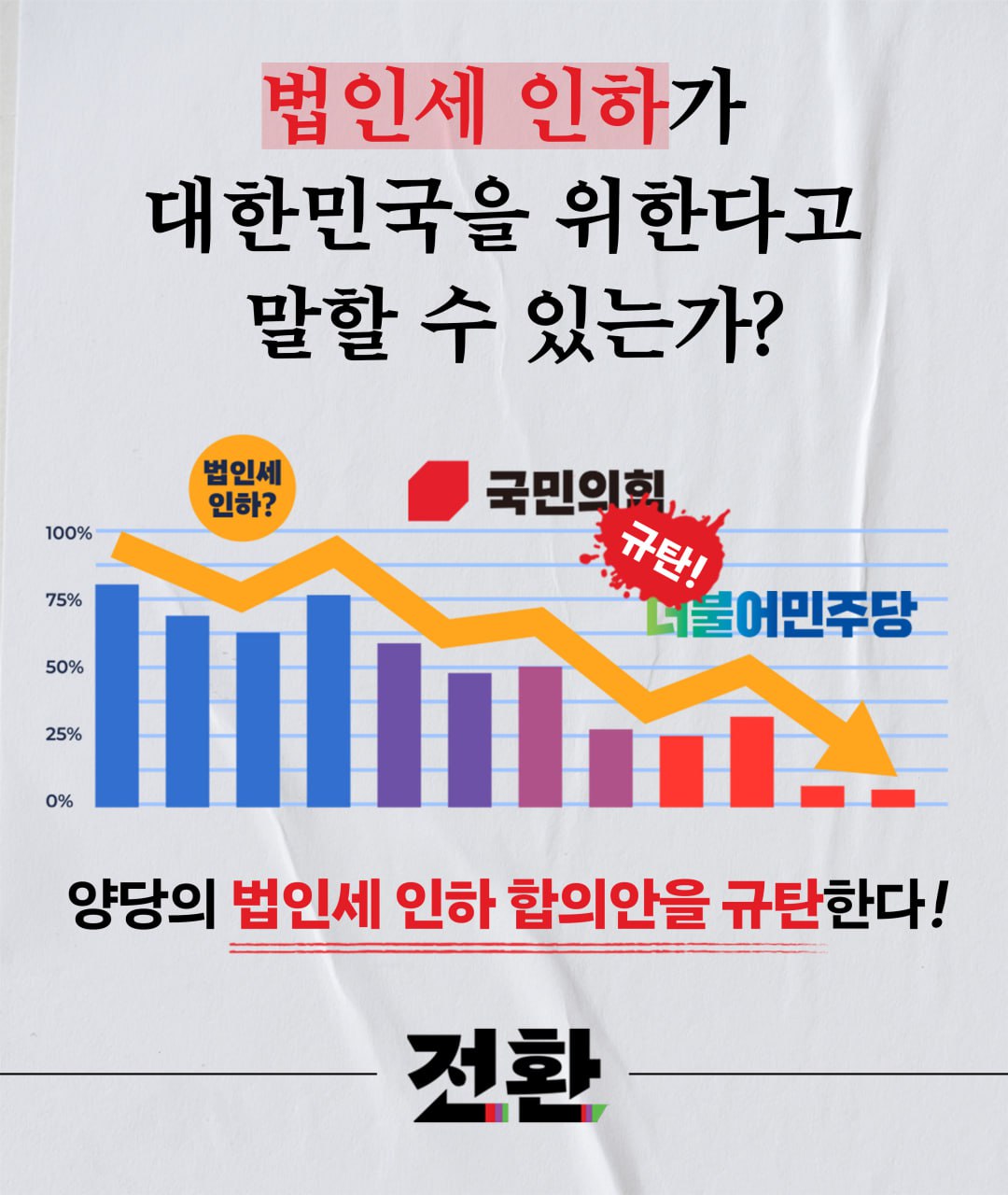 핵심은 이러한 조치를 견제할 목소리가 대한민국에 없다. 민주당조차, 국민 감세 3법을 통해, 중소 및 중견기업 법인세율 인하를 추진한다. 따라서, 두 양당 모두 감세를 통해 지지 기반을 확보하고자 애쓸 뿐 복지 사각지대에 있는 이들을 주목하지 못한다. 법인세 인하는 시기, 명목, 효율성을 모두 고려했을 때 오판이다. 이미, 러-우 전쟁과 코로나19로 경제 상황은 절체절명의 위기에 봉착했다. 이에 효과가 검증되지 않은 부자 감세 정책을 펼치는 것은 단순히 정파적인 해답일 뿐이다. 정부와 두 양당이 감세에 집착하지 않고, 저소득층 보호와 노동구조 개선을 위한 답안을 우선 제시하길 요구한다.
