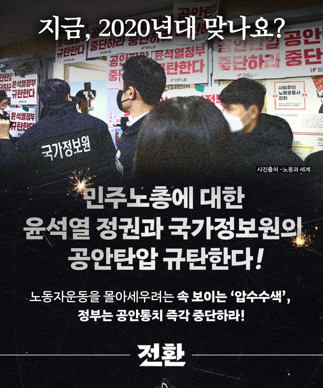 우리는 속 보이는 ‘압수수색’ 시도를 통해 공안정국을 조성하는 윤석열 정권과 국가정보원을 규탄하며, 즉각적인 탄압의 중단을 요구한다. ‘외교참사’ 등으로 위기에 처한 정권이 공안통치를 통해 스스로의 잘못을 잠시 감출 수 있을지는 모른다. 그러나 무리하고 부당한 탄압이 이어질수록 인간답게 일하고 생활할 권리를 노동조합을 통해 쟁취하고자 하는 더 많은 시민들의 저항에 부닥치게 될 것이다.