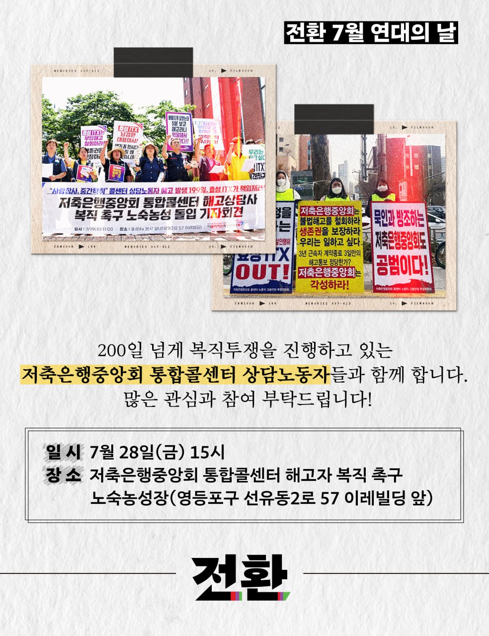 200일 넘게 복직투쟁을 진행하고 있는 저축은행중앙회 통합콜센터 상담노동자들과 함께 합니다. 회원동지들의 많은 관심과 참여를 부탁드립니다~